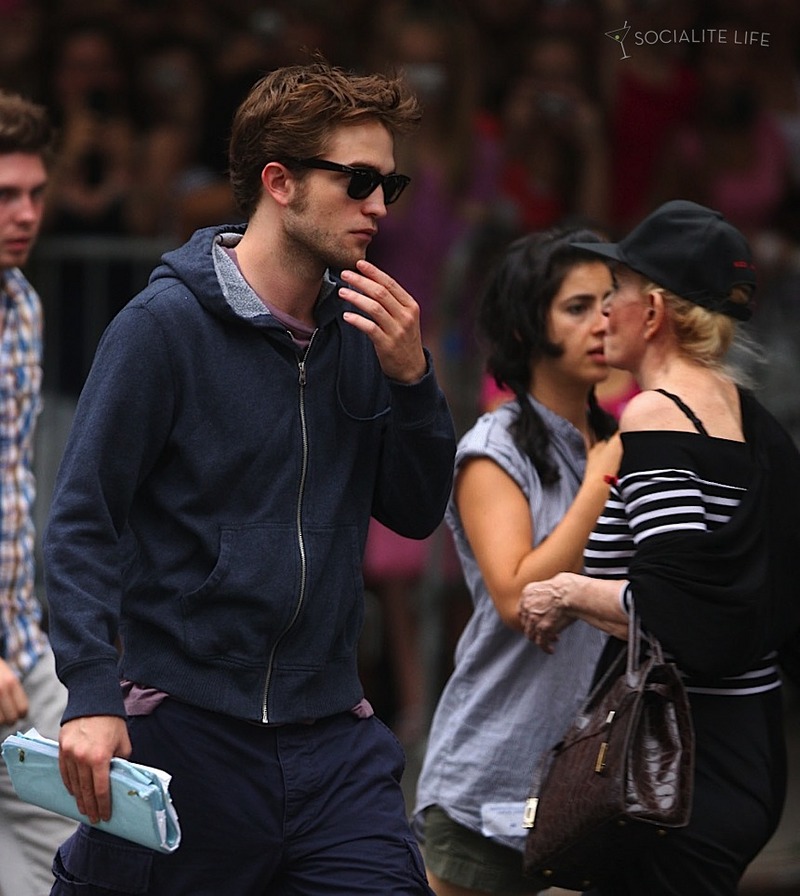 I’ve been tossing up whether to post these or not all day. Not to cheat you of anything because some of you will probably have already seen them, but I’m just a bit sick of the throngs of people in the background. Anyway, I thought I’d better put a warning because there are definite *spoilers* (if that’s possible with the amount of photos that have circulated for this film) behind the cut. The pics are from yesterday and as I have said before – you might not like what you see. So to counterbalance here’s a great shot from today. Thanks to our affiliate MrPattinson for the *spoiler* photos and socialitelife for today’s.