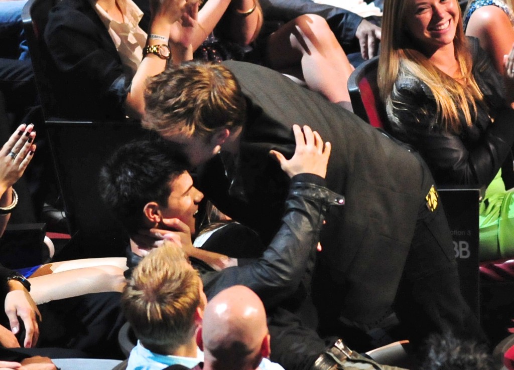 - Pattinson plants one on Taylor Lautner. Yeah, we were all soooo surprised when Robert and Kristen Stewart won for Best Kiss (again). But before we could even start to yawn, Pattinson declared he didn’t “feel like kissing†Stewart and dashed off the stage into the crowd to give a big sloppy kiss to “someone who would appreciate it more†– Taylor Lautner! Priceless. Check out the video! [Maria:  Click on The Stir hyperlink if you haven’t seen it]